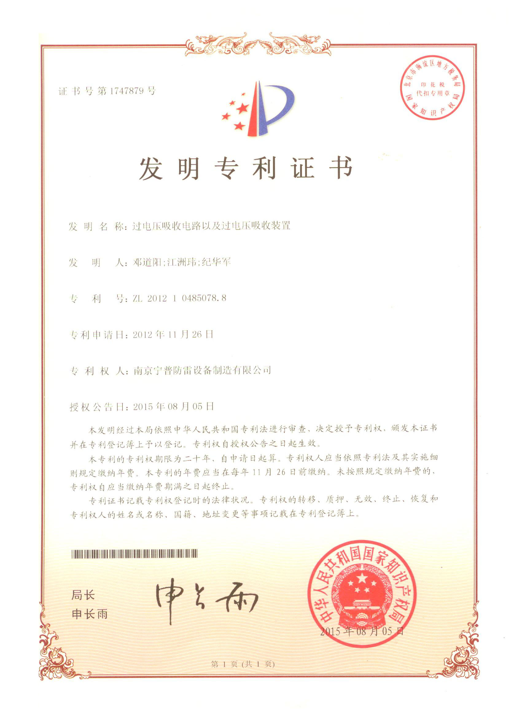 寧普防雷憑借自身領(lǐng)先的研發(fā)水平和先進(jìn)的創(chuàng)新理念,于2015年8月份再獲國家知識產(chǎn)權(quán)局頒發(fā)的“過電壓吸收電路以及過電壓吸收裝置”發(fā)明專利證書。